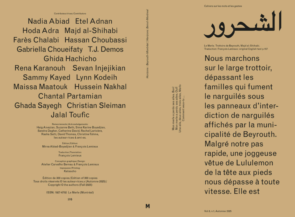 Mirna Abiad-Boyadjian et François Lemieux préparent le lancement du prochain numéro cet automne. Ce numéro explore la notion d’horizon et l’expérience de sa possible absence, nourrissant l’échange entre le Liban et sa diaspora. Il rassemble une constellation de pensées qui interrogent tour à tour les imaginaires de l’habiter et de l’exil, le jeu des frontières invisibles et de la distance, les pratiques de résistance dans la production d’images et dans les représentations politiques du sectarisme, de l’écologie et de l’expérience propre à l’urbanité libanaise. Il inclut des contributions de Nadia Abiad, Etel Adnan, Hoda Adra, Majd al-Shihabi, Farès Chalabi, Hassan Choubassi, Gabriella Choueifaty, T.J. Demos, Ghida Hachicho, Rena Karanouh, Sevan Injejikian, Sammy Kayed, Lynn Kodeih, Maissa Maatouk, Hussein Nakhal, Chantal Partamian, Ghada Sayegh, Christian Sleiman, Sandra Dagher, Catherine David, Rasha Salti, Christine Tohme, Jalal Toufic et Mahmoud Darwich. Le Merle remercie chaleureusement les auteur·rices·x.